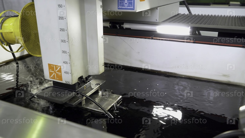 Металлическая резка под водой на заводе. Сцена. Обработка стальной части, которая охлаждается водопроводным и вентиляторным агрегатом на предприятии. Подводная методология резки металла