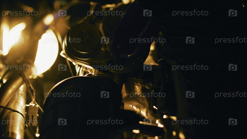 Трубы и детали на фоне света. Скриншоты. Близкий план внутри механизма много сложных труб и железных деталей на фоне яркого желтого света