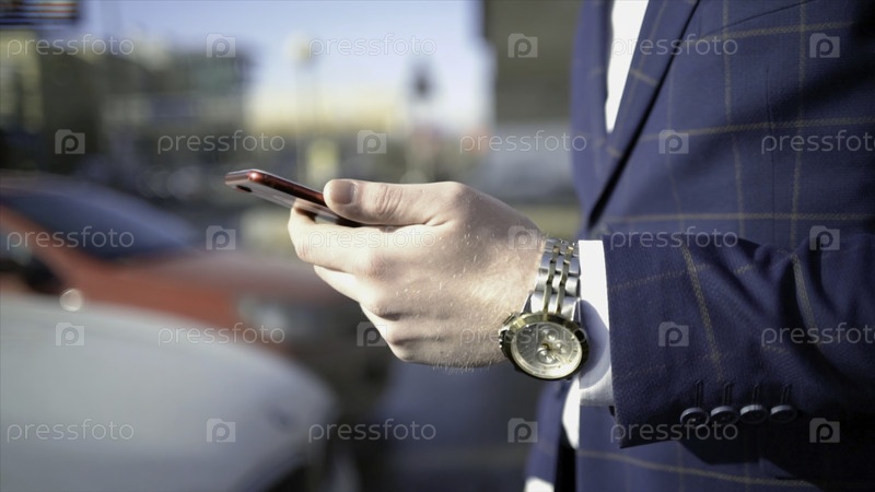 Ближайший снимок бизнесмена, нажимающего ключ от автомобиля. Действие. Бизнесмен открывает автомобиль с помощью электронного ключа и смотрит на телефон. Современный автоключ для его открытия и запуска