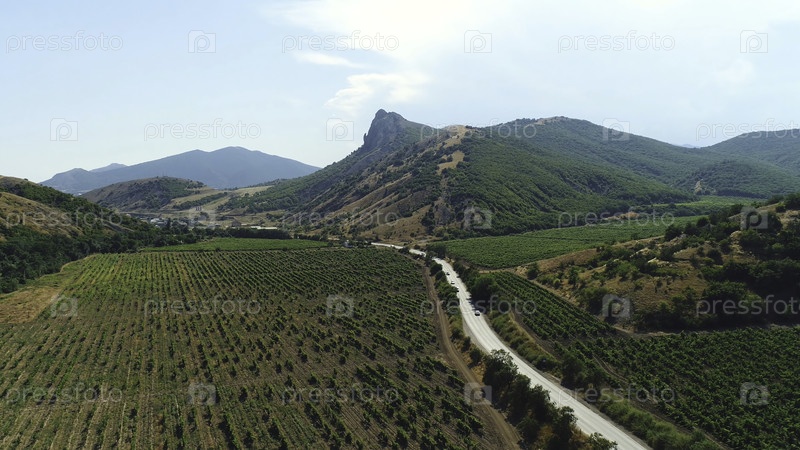 Вид с воздуха на дорогу с движением транспорта между зелеными полями фермы и горами, покрытыми травой против синего неба в солнечный день