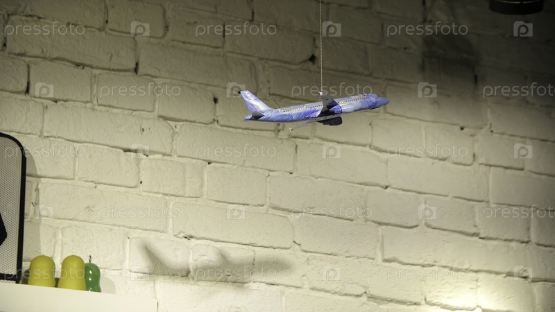 Висящая игрушечная модель самолета, белый кирпичный фон 4K