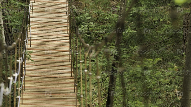 Вид на пустой деревянный подвесный мост в лесу Национального парка, Танзания.Красивый деревянный висячий мост колеблется после ступеней