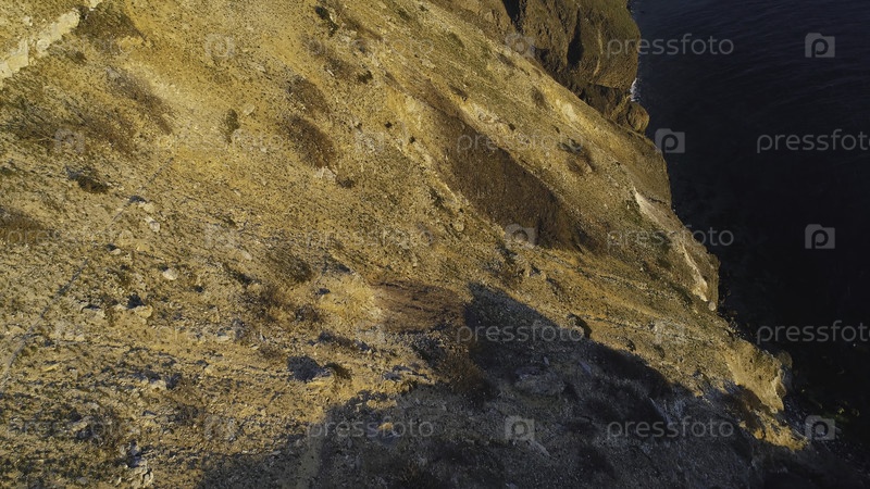 Вид сверху береговой скалы с голубым морем на закате. Снимок. Прекрасный вид золотистого света заката на каменистых скалах морского побережья с синими водами