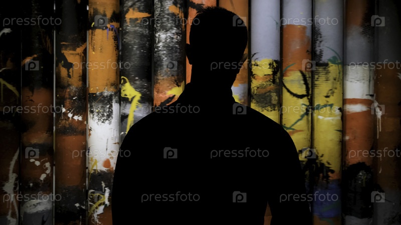 Мужчина смотрит на художественную картину в музее, задний вид.Мужской силуэт смотрит на вращающиеся трубки, покрытые красочными мазками кисти в темной комнате