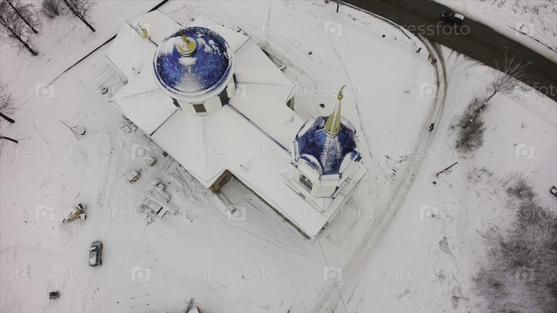 Зимний лес при закате солнца возле реки, вид из воздуха на старую церковь с голубой крышей