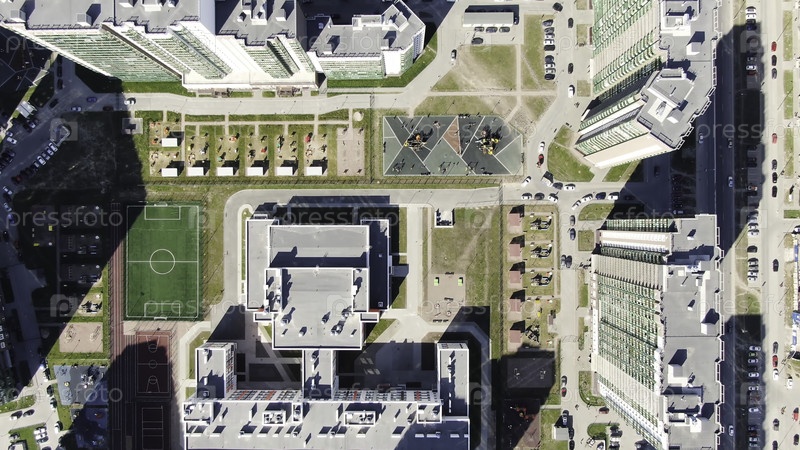 Вид сверху нового красочного жилого района в летний вечер.Движение.Вид сверху нового жилого района с детскими площадками и парковкой для автомобилей