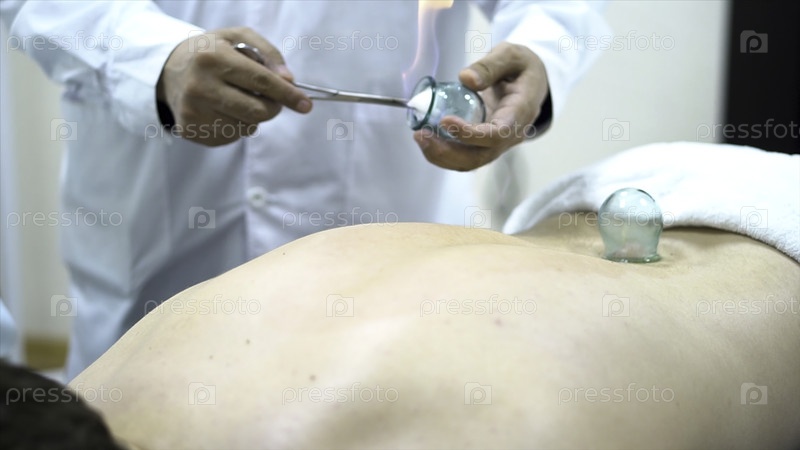 Акупунктурный терапевт кладет чашку на спину пациента-мужчины, древняя китайская альтернативная медицина