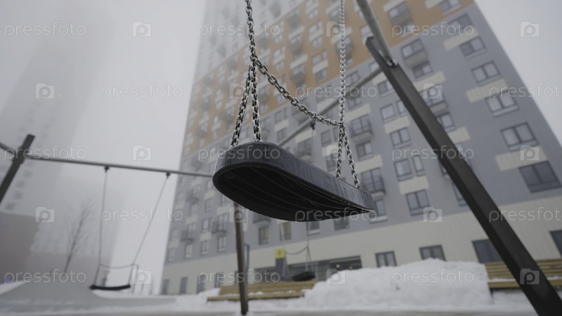 Колебание на фоне домов в тумане. Действие. Пустое колебание жутко раскачивалось на фоне тумана. Пустая игровая площадка в облачную туманную погоду