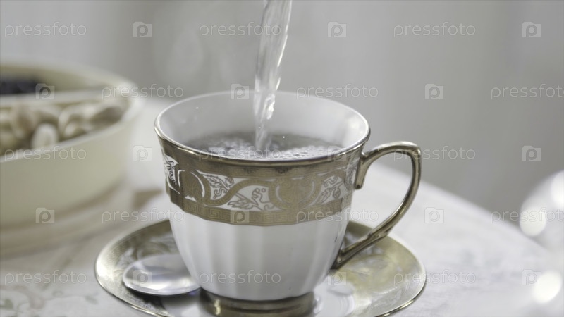 Ближайшее изображение фарфоровой кружки белого и золотистого цвета, стоящей на столе с горячим чаем. Стоковые кадры. Горячая вода наливается в керамическую чашку на столе
