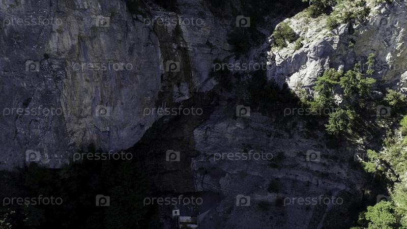 Птичий взгляд на горную сторону, скалистые образования с зелеными деревьями. Снимок. Вид из воздуха удивительного крутого зеленого склона горы в солнечный летний день