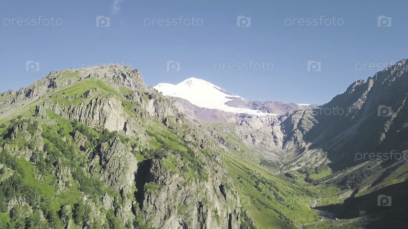 Вид сверху горного пейзажа со снежными вершинами и зелеными склонами. Клип. Величественные скалистые горы с зеленым лесом и заснеженными пиками. Впечатляющий горный ландшафт в солнечный день