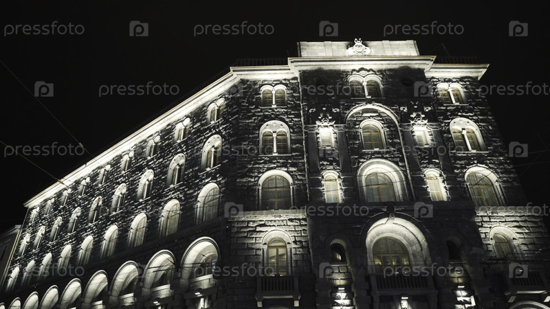 Яркое освещение окон исторического здания. действие. снизу вид на историческое каменное здание с белым освещением на фоне ночного неба