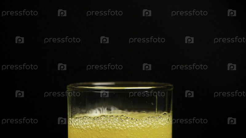 Сливка апельсинового напитка. замедленное движение. газированный оранжевый напиток заливается в стакан. налив соды из апельсинового сока в стакан в замедленном режиме, черный фон