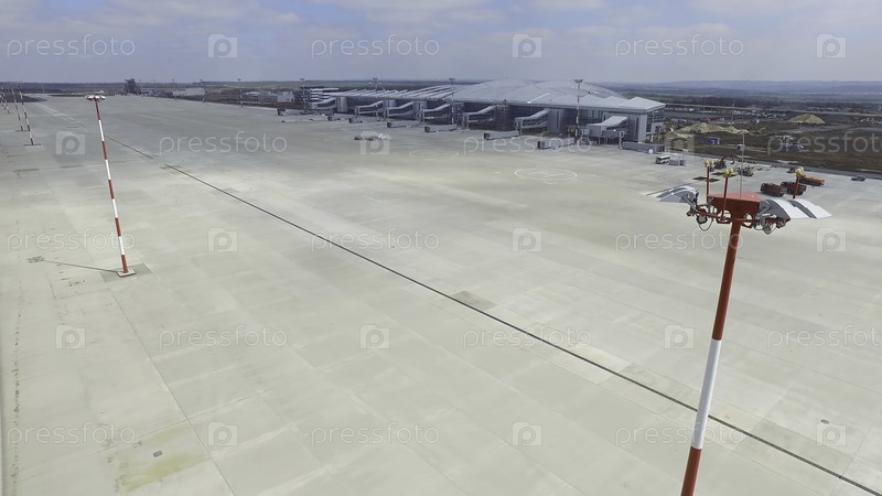 Аэрофотосъемка современного терминала международного аэропорта. Путешествие по миру. Пустая антенна аэродрома. Вид на взлетно-посадочную полосу в аэропорту. Маркировка аэродрома на подъездной дороге направляется к взлетно-посадочной полосе 4K