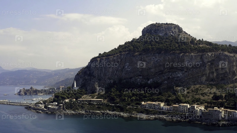 Вид с воздуха на захватывающую дух гору, расположенную у побережья моря и прибрежного города. Скриншоты. Летающий над бирюзовой поверхностью воды и каменистым берегом на фоне синего облачного неба