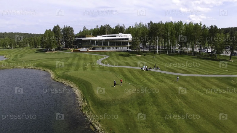 Солнечная тележка для гольфа с облаками на синем небе и лесным озером Гольф-клуб, воздушный