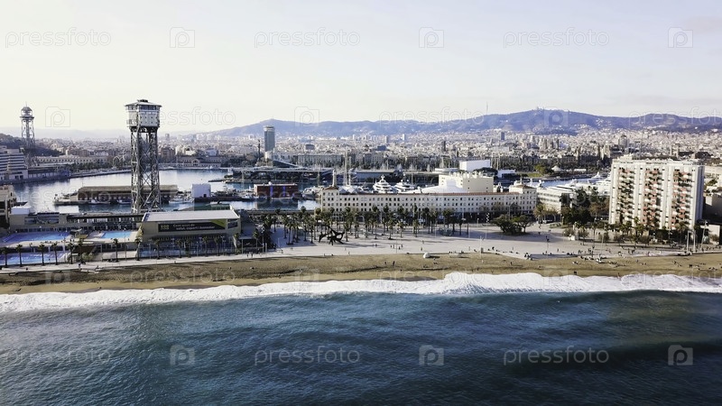 Вид с вершины современного города на берегу моря. акции. красивый город на пляже в солнечный день