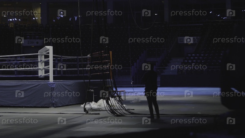 Драматический вид на красный угол обычного боксерского ринга, окруженного веревками и освещенных прожектором