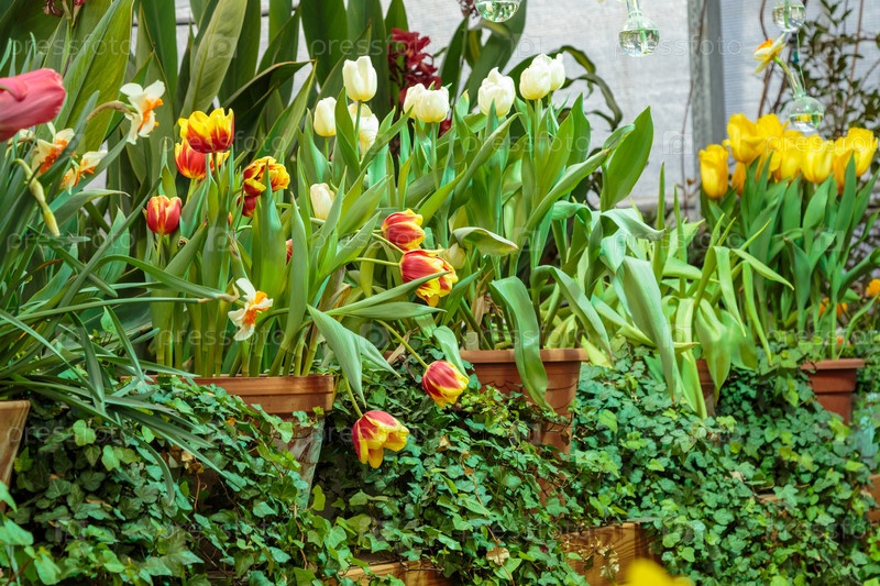 Цветы в зеленой комнате. цветочный букет магазин. цветящие растения и многоцветные цветы внутри садового центра