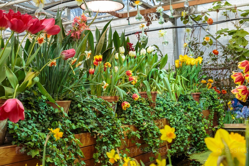 Цветы в зеленой комнате. цветочный букет магазин. цветящие растения и многоцветные цветы внутри садового центра