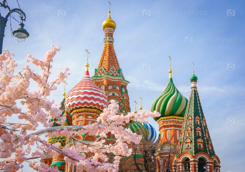 Московский и собор Святого Василия в весенний день через цветущее дерево