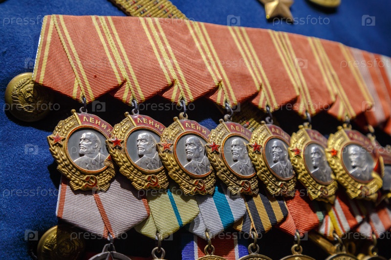 Москва, Россия - 23 января 2019: Центральный музей вооруженных сил. Различные награды, ордена и медали на форме российской армии. Память о наградах и медалях Второй мировой войны и Великой Отечественной войны