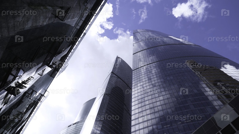 Вид снизу стеклянных небоскребов на фоне синего неба. Действие. головокружительный вид бизнес-высотки в центре современного города. Стеклянные небоскребы отражают голубое небо