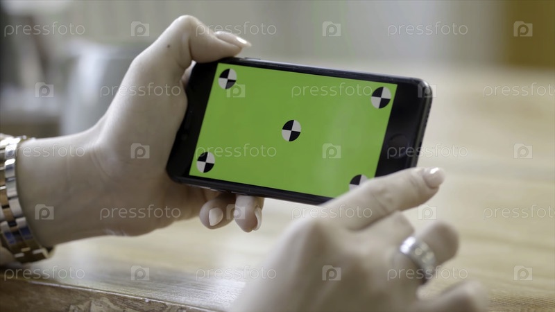 Близкий снимок женщины, держащей телефон с зеленым экраном. Фрагмент кадров. Красивая женская рука, держащая телефон вертикально со зеленым экраном. Смотрите видео на телефоне