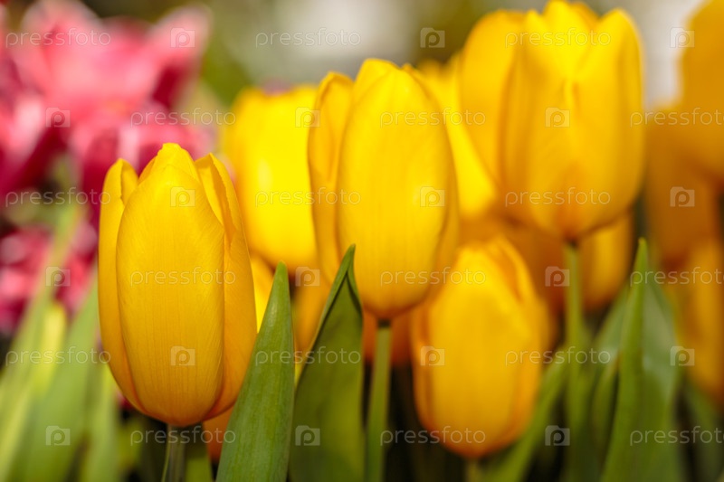 Ближайшее изображение красивых тюльпанов. Весенние цветы на фоне цветения. Свежие растения в саду. Поле тюльпанов