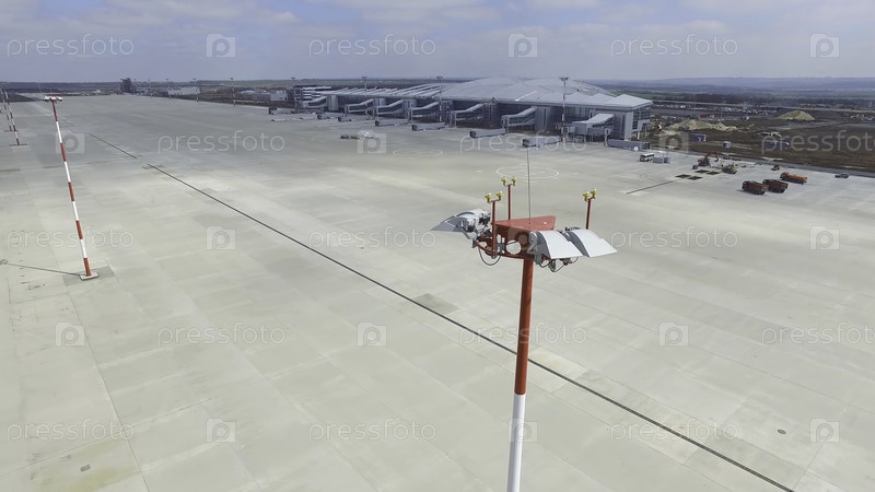 Вид из воздуха на современный терминал международного аэропорта. Путешествие по миру. Пустая аэродромная антенна. Вид на взлетно-посадочную полосу в аэропорту. Маркировка аэродрома на подъездной дороге направляется к взлетно-посадочной полосе