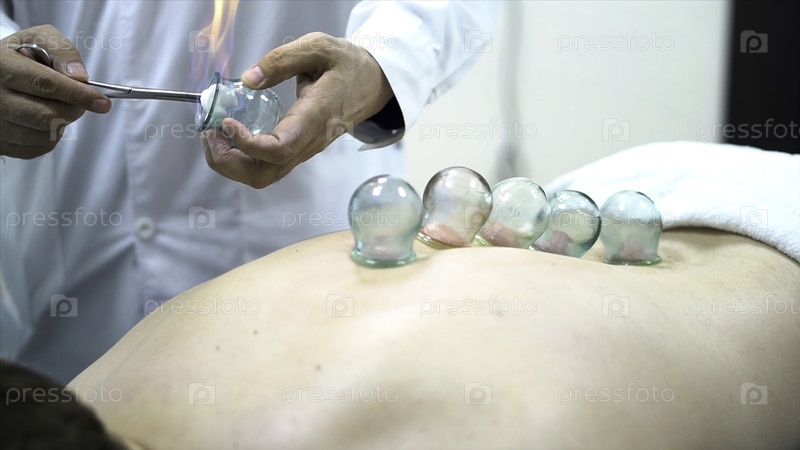 Акупунктурный терапевт кладет чашку на спину пациента-мужчины, древняя китайская альтернативная медицина