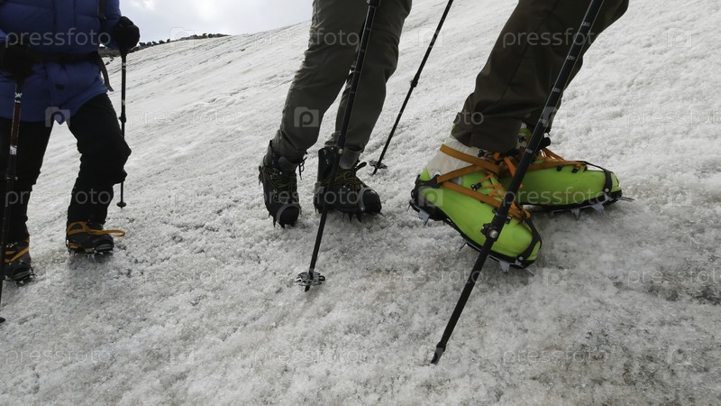 Ноги восходящих альпинистов в специальных снежных ботинках на вершинах гор. ноги альпинистов, идущих один за другим в обуви с шипами и палками для подъема