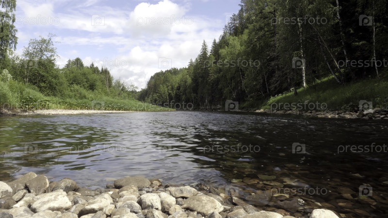 Горная река протекает на фоне зеленого леса. Файлы кадров. Потоки горных рек успокаиваются и заполняются силой. Холодная горная река в лесу оживляет походы в жаркое лето