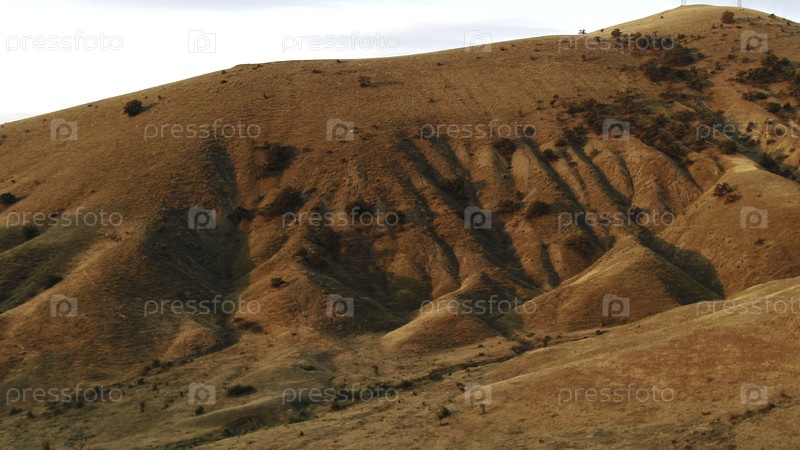 Прекрасный вид на красные холмы, покрытые кустами против чистого синего неба в солнечный день