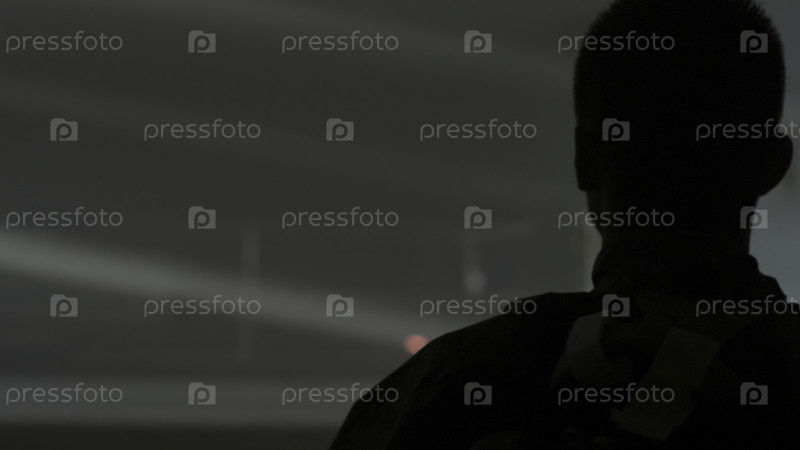 Сзади вид на человека с рюкзаком, идущего по заброшенному старому складу и света со крыши.Человек с рюкзаком входит в старый спортивный зал, где дым и свет с крыши.Молодой человек на старом заброшенном заводе