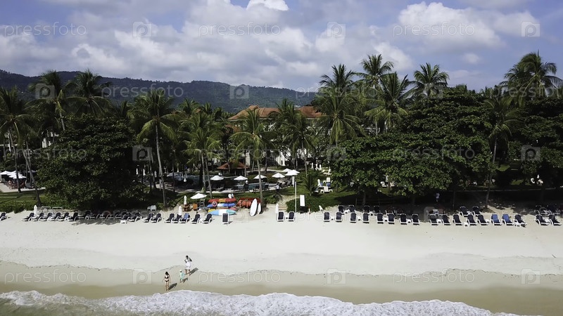 Красивый тропический остров с песчаным пляжем, пальмами. Вид из воздуха на тропический пляж на острове. Тропический ландшафт: пляж с пальмами. Морской пейзаж: Океан, небо, море