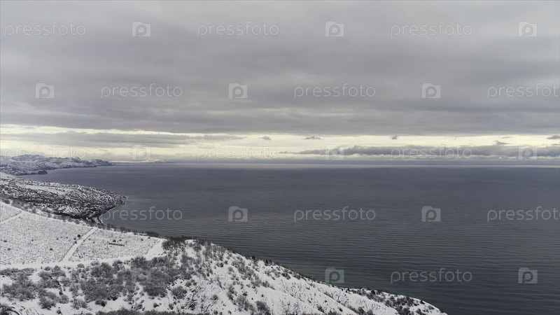 Красивый зимний морской пейзаж со снежными полями, лесом и голубым морем на сером облачном фоне