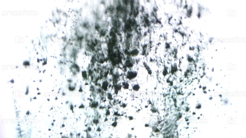 Туркуазная сухая чернила падает в воду, растворяется и окрашивается на белом фоне. аква синий цвет краски реагирует с водой создавая абстрактные облачные образования