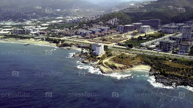 Прекрасный пейзаж современного города между горами с одной стороны и синим морем с другой