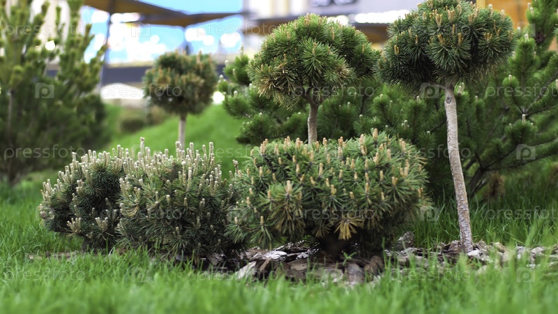 Зеленые саженцы хвойных деревьев в саду. Снимок фондов. Молодые хвойные деревья с конусами, посаженными в ухоженном саду со зеленой лужайкой
