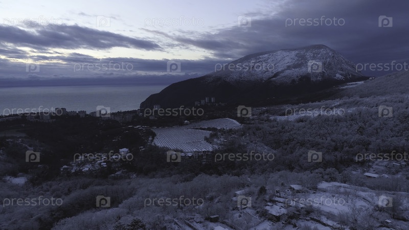 Вид сверху города возле моря зимой.Снимок Снежные просторы в горной местности недалеко от города
