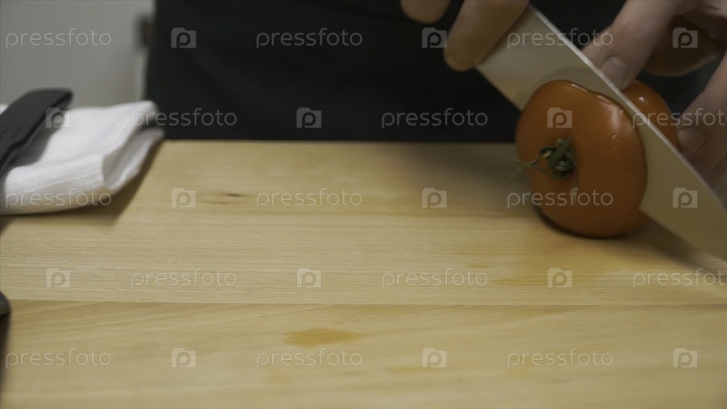 Снимайте помидоры наполовину. клип. кулинария, еда и домашняя концепция - ближайший снимок мужского ручного резания перца на доске для резки дома. близкий снимок мужского ручного резания томата