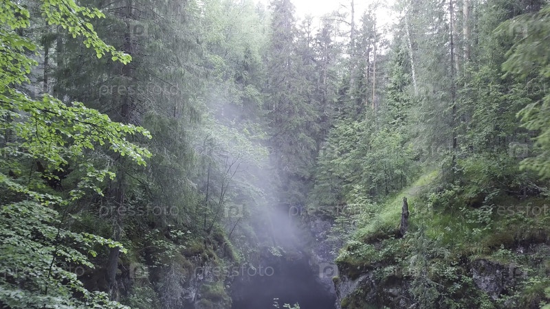 Прекрасный туманный утренний вид на туманное ущелье в густом зеленом летнем лесу.В воздухе смешанные леса и крутые скальные склоны