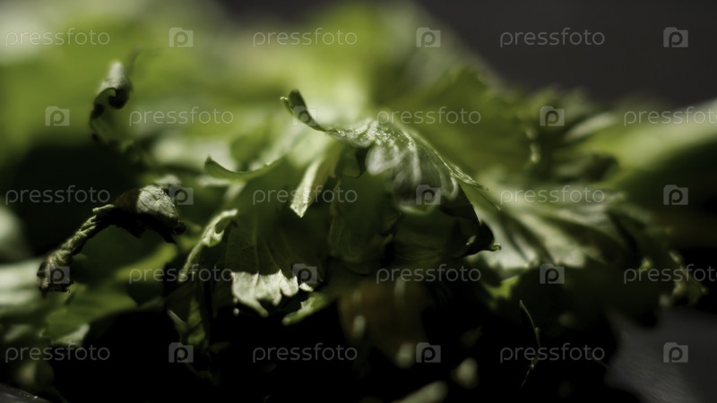 Ближайшее изображение зеленых листьев петрушки начинает увядать на черном фоне, концепция пищи
