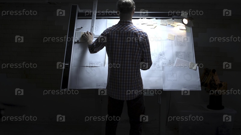 Молодой инженер стоит у доски с чертежом и планом заднего вида. мужчина-архитектор, стоящий на чертежной доске и плане этажа в офисе с карандашом в руке
