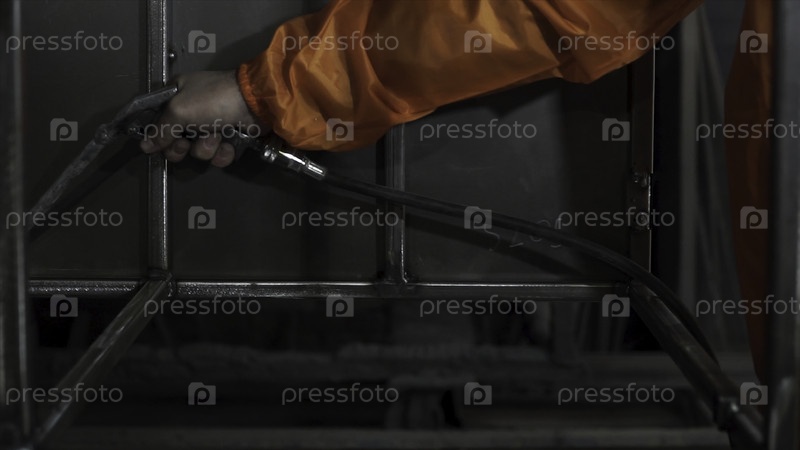 Продувание воздуха на металлические детали перед покраской в порошок. Клип. Работник с защитным оборудованием очищает металлическую конструкцию, прежде чем красить их. Алюминиевая пылесосильная пушка для проветривания пистолета Clean Handy Tool