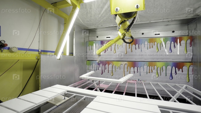 Автоматизированная роботизированная рука красит оконную раму в современном оборудовании окрасочного завода