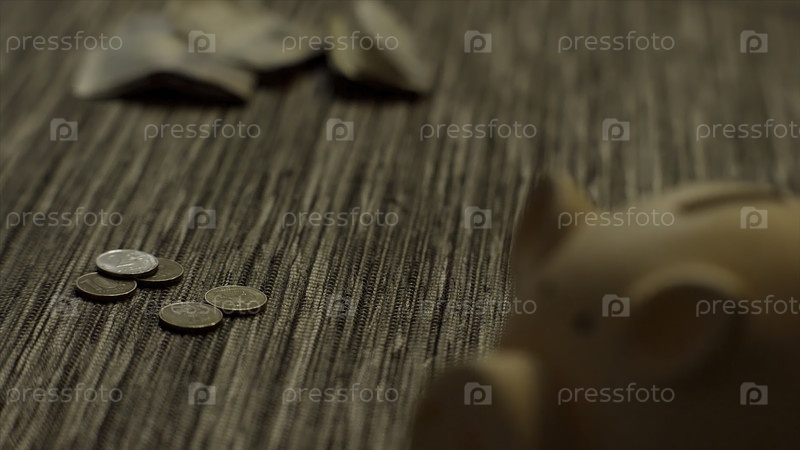 Закрыть для кошелька с монетами, падающими на старый деревянный стол, экономия денег концепция. розовый денежный ящик со многими монетами, падающими и лежащими на столе
