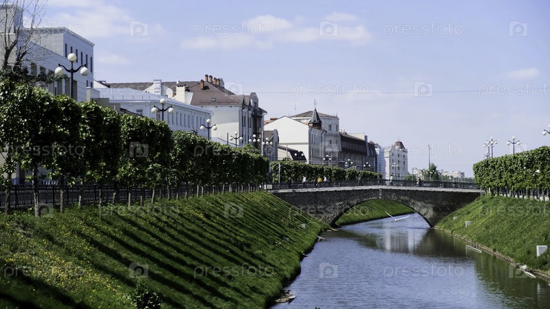 Красивый городской пейзаж с узким каналом и двумя склонами, покрытыми зеленой травой на фоне голубого облачного неба