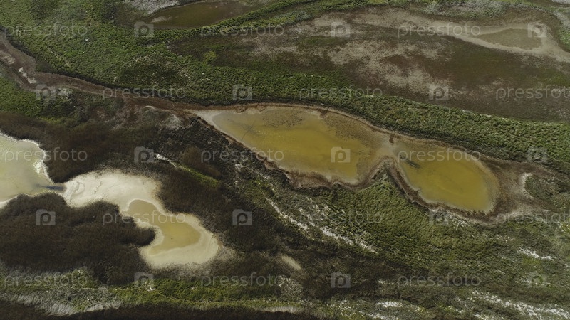 Вид сверху на образцовую грязную воду из болота. Снимок. Кисловатая коричневая вода со зелеными зарослями выглядит как искусство жидкости сверху. Естественное искусство земной поверхности
